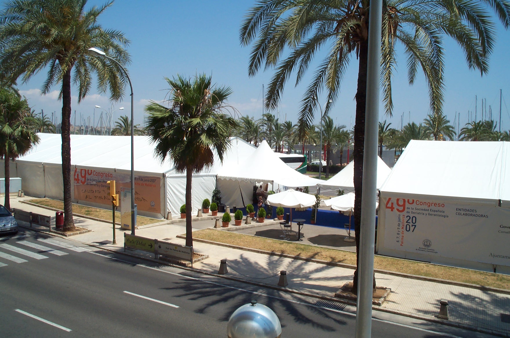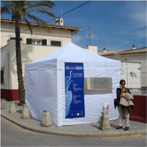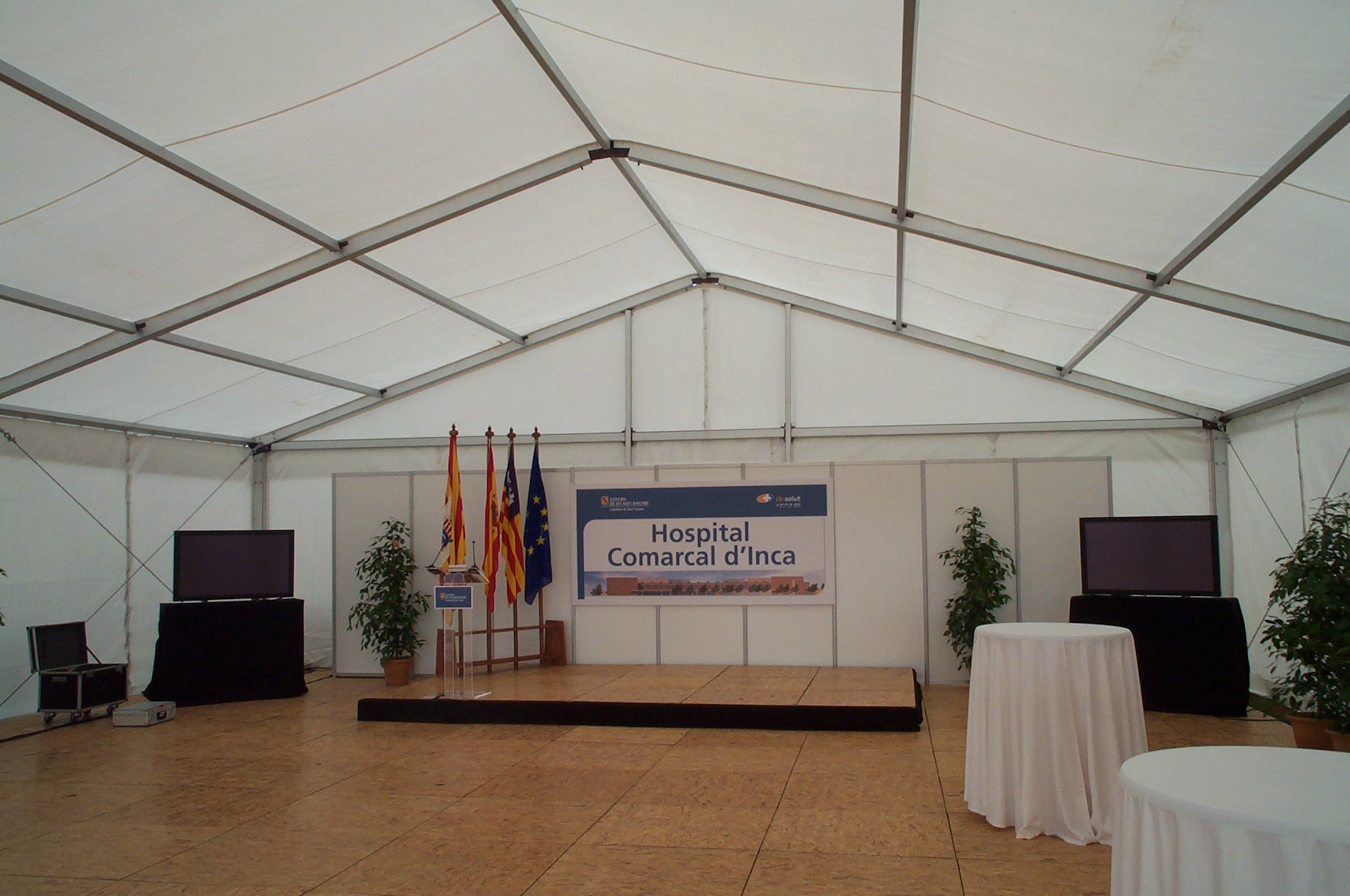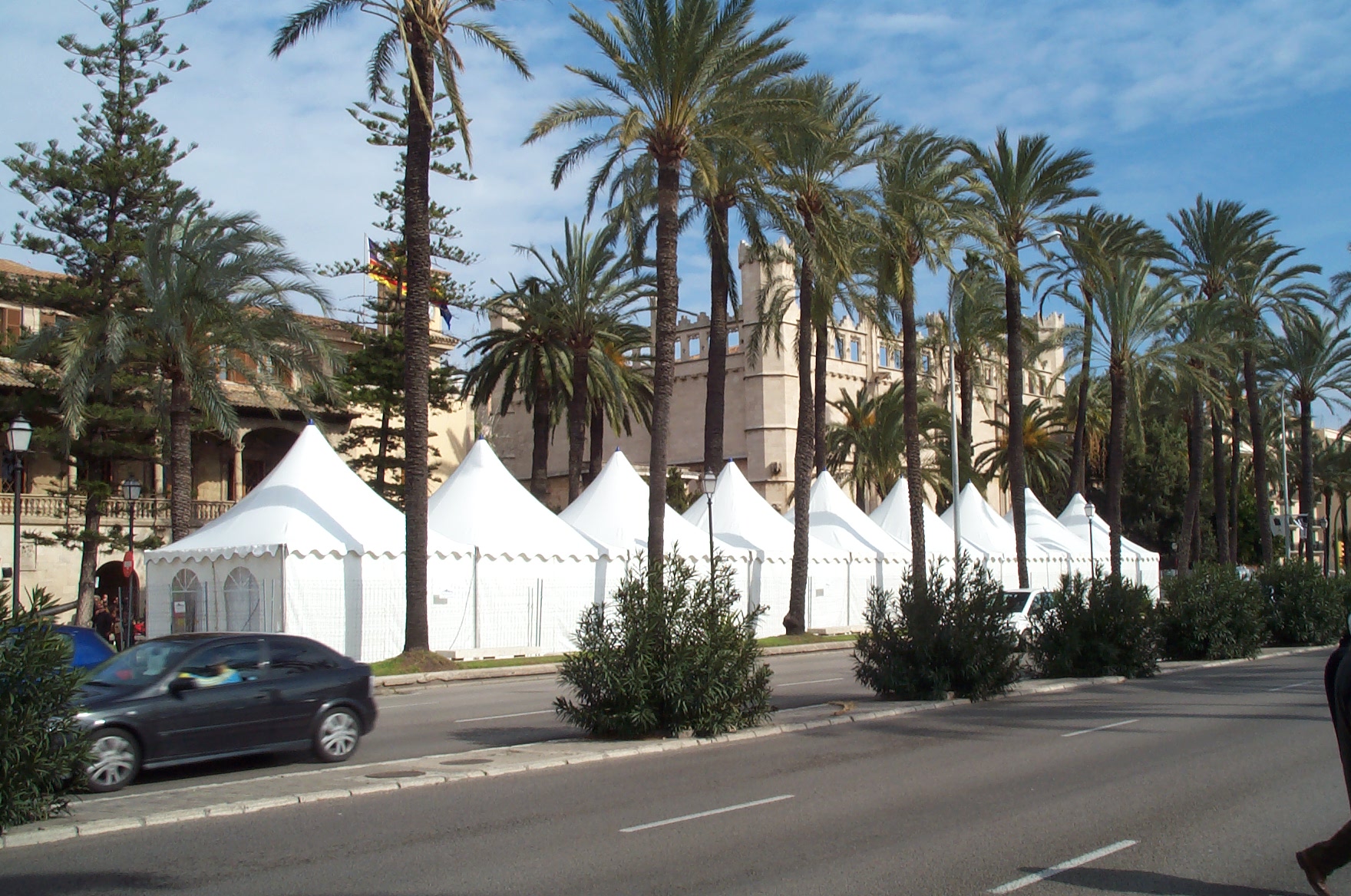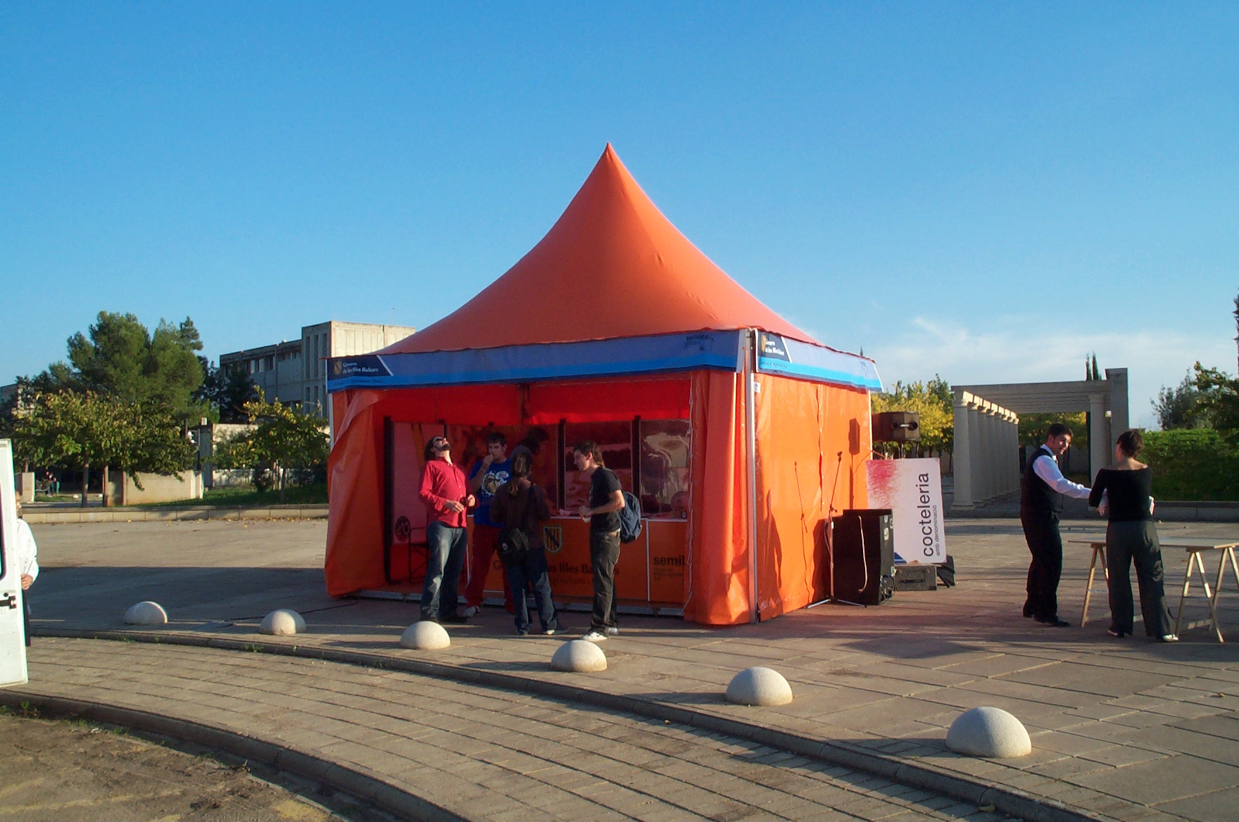 Las carpas desplegables son muy económicas. Es ideal para eventos de corta duración. Puede ser transportada e instalada por el propio cliente. Pueden ir adosadas entre ellas. Se trata de una estructura con pies telescópicos y techo plegable. Esta construida con perfilería de aluminio anodizado de 40 x 40 mm. Existen dos tipos de techos; compuesto fino – ideal para el verano – y compuesto p.v.c. mas grueso para una mayor protección climática. Las cortinas perimetrales pueden ser ciegas o con ventanA transparente. Van unidas a la estructura mediante cinta tipo “velcro”.Todas las carpas disponen, opcionalmente, de iluminación, tarima, moqueta, vestidura interior, y en definitiva, todo lo necesario para un evento perfecto.