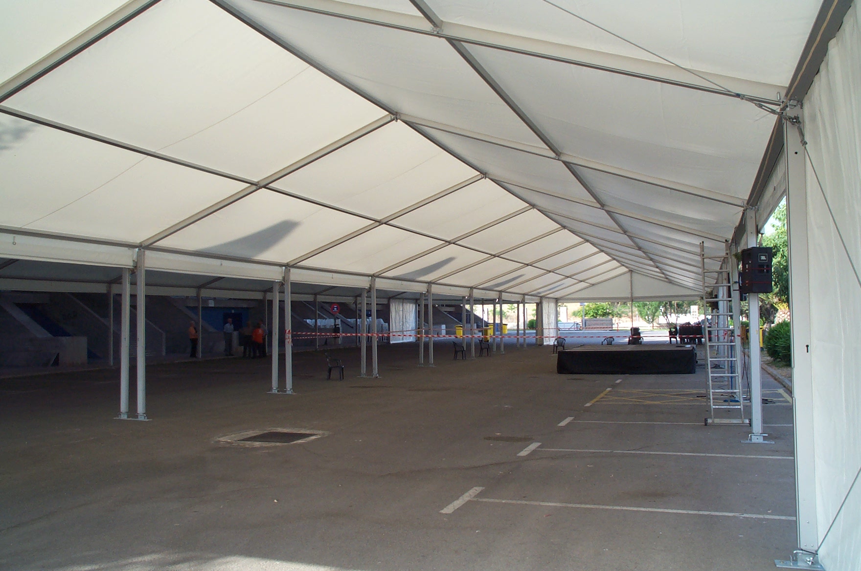 La carpa pabellon estan formadas por techos a dos aguas o en semi-curvo. Las medidas más usuales son 8,10, 12 y 15 mts de ancho (pórtico) ampliables en su longitud mediante módulos de 5 mts. En montajes especiales, es posible llegar hasta los cincuenta metros de pórtico por el largo necesario, en módulos de cinco [...]
