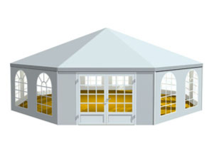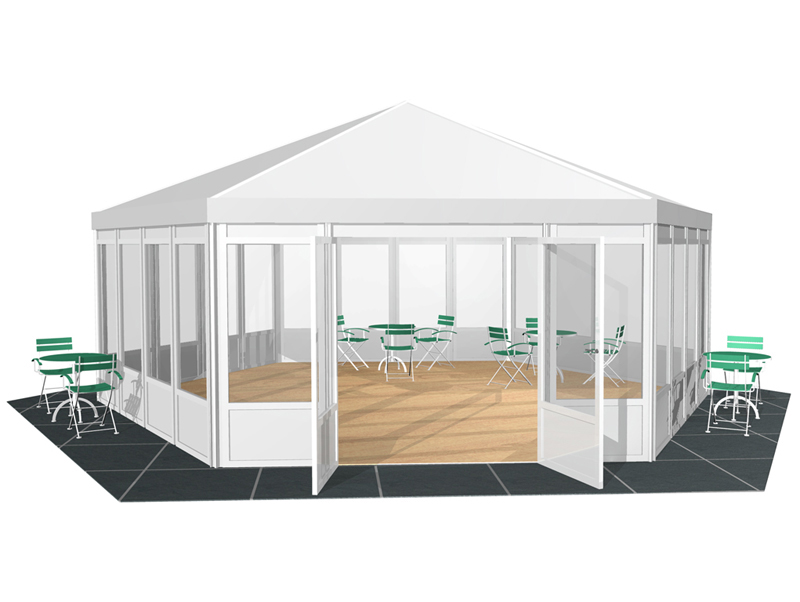 Las carpas hexagonales con una nueva concepción de carpa. Permite crear un “hall” en las entradas de las carpas pabellón.